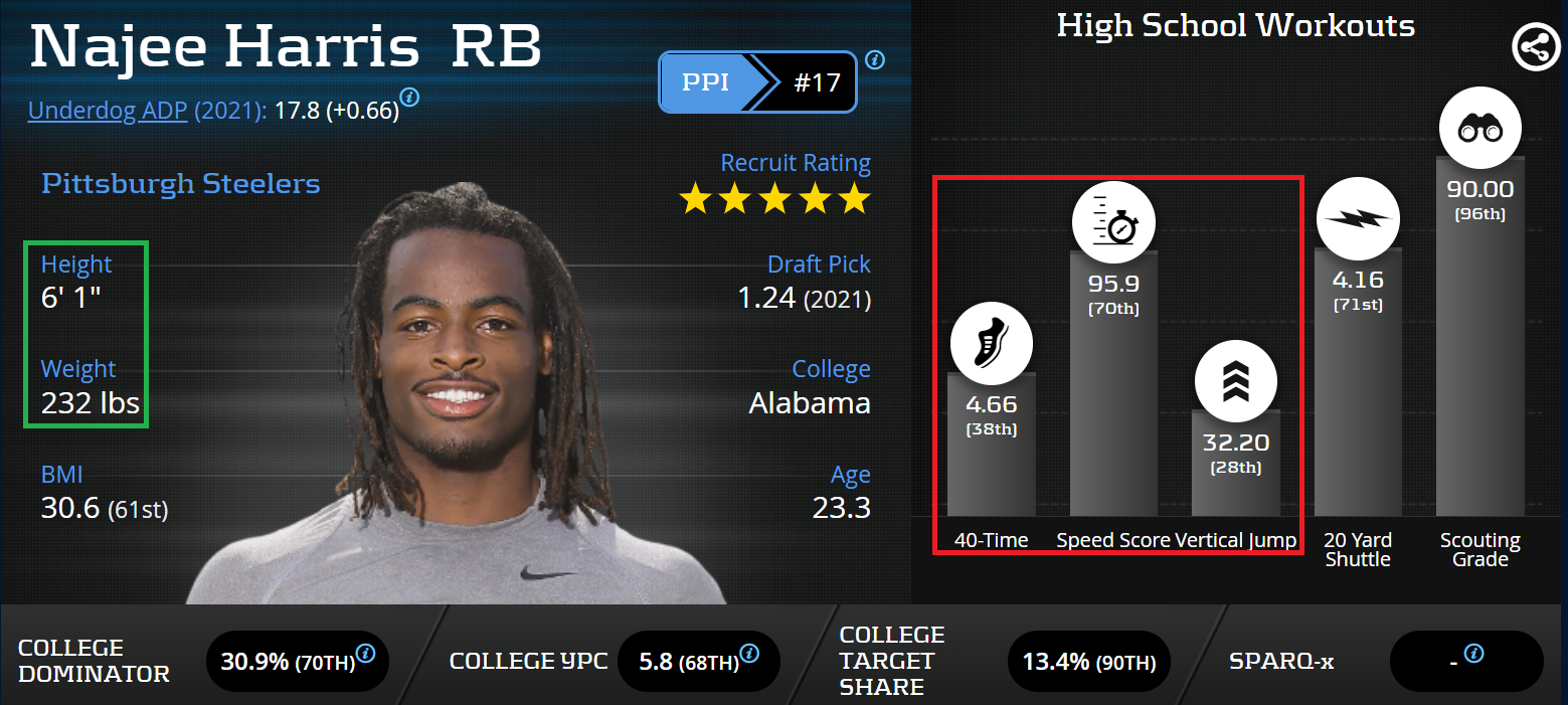 Measuring at 6-1 and 232-pounds, Najee Harris has the adequate size to be a bell-cow running back in the NFL. On the other hand, his glaring lack of Pro Day workout metrics was concerning for dynasty managers in rookie drafts. Unlike Jonathan Taylor (2020) and Saquon Barkley (2018), Harris was far from being the 1.01 lock in non-Superflex drafts despite his similar build to Taylor and Barkley.