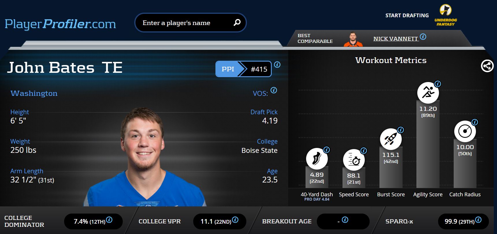 If Tre McKitty is something of a project, then I’m not sure how best to describe John Bates. He has decent size for the tight end position, standing 6-5 and weighing 250-pounds. He also posted an 11.20 (89th-percentile) Agility Score. But as a receiver, any ability he has is yet to be fully realized.
