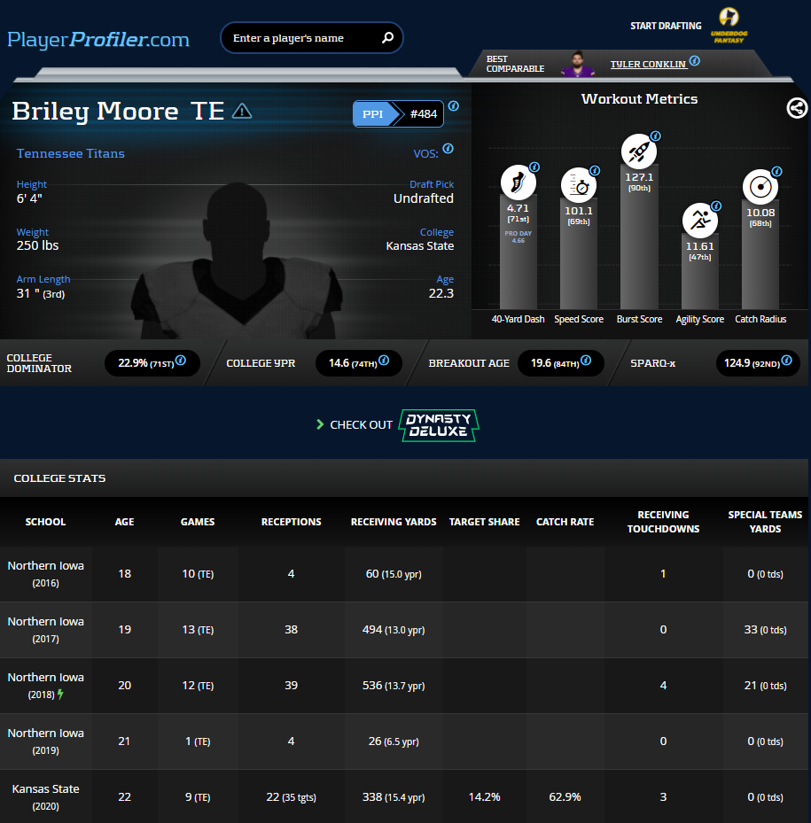 The 22-year old Kansas State product has solid workout metrics across the board, highlighted by a 127.1 (90th-percentile) Burst Score. Add in a 22.9-percent (71st-percentile) College Dominator Rating, a 14.6 (74th-percentile) College Yards Per Reception average, and a 19.6 (84th-percentile) Breakout Age and one has to wonder how this dude went undrafted. Moore played a pivotal role for a few years for Northern Iowa. A shoulder injury forced him out of the 2019 season after Week 1, and he then transferred to Kansas State for his fifth year. Playing for smaller schools and logging a shortened season after transferring was too much for teams to look past. Too bad. Tennessee may have nabbed the steal of this UDFA class.