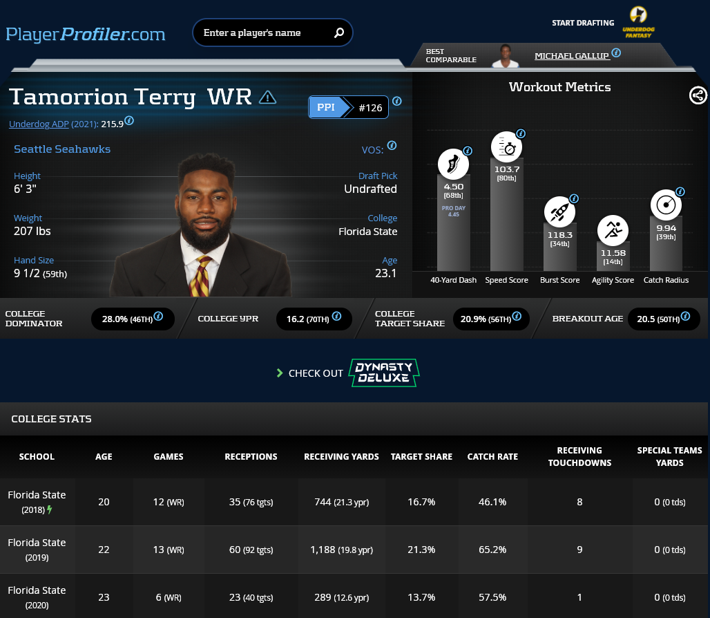 At 6-3 and 207-pounds, Terry ran a 4.50 (68th-percentile) 40-yard Dash and posted a 103.7 (80th-percentile) Speed Score. Though the Burst and Agility Scores were underwhelming, he produced during his three years at Florida State, including a sophomore season with 1,188 receiving yards and nine touchdowns. That yardage total was over three times higher than the next player on the list; D.J. Matthews with 355 yards. Sure, Eskridge will have his opportunity and there are other players to pass along the depth chart, but should Terry impress early in camp, Pete Carroll has shown he’ll ride talent over draft capital (a la Russell Wilson).