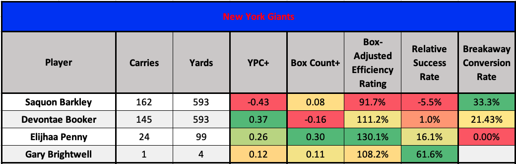 Saquon Barkley missed several games with a low ankle sprain last season, and Devontae Booker took over most of the ball carrying duties in his absence. In addition to light work from Elijhaa Penny and a solitary attempt from Gary Brightwell, here are the full rushing efficiency profiles for each of the Giants running backs from last season: