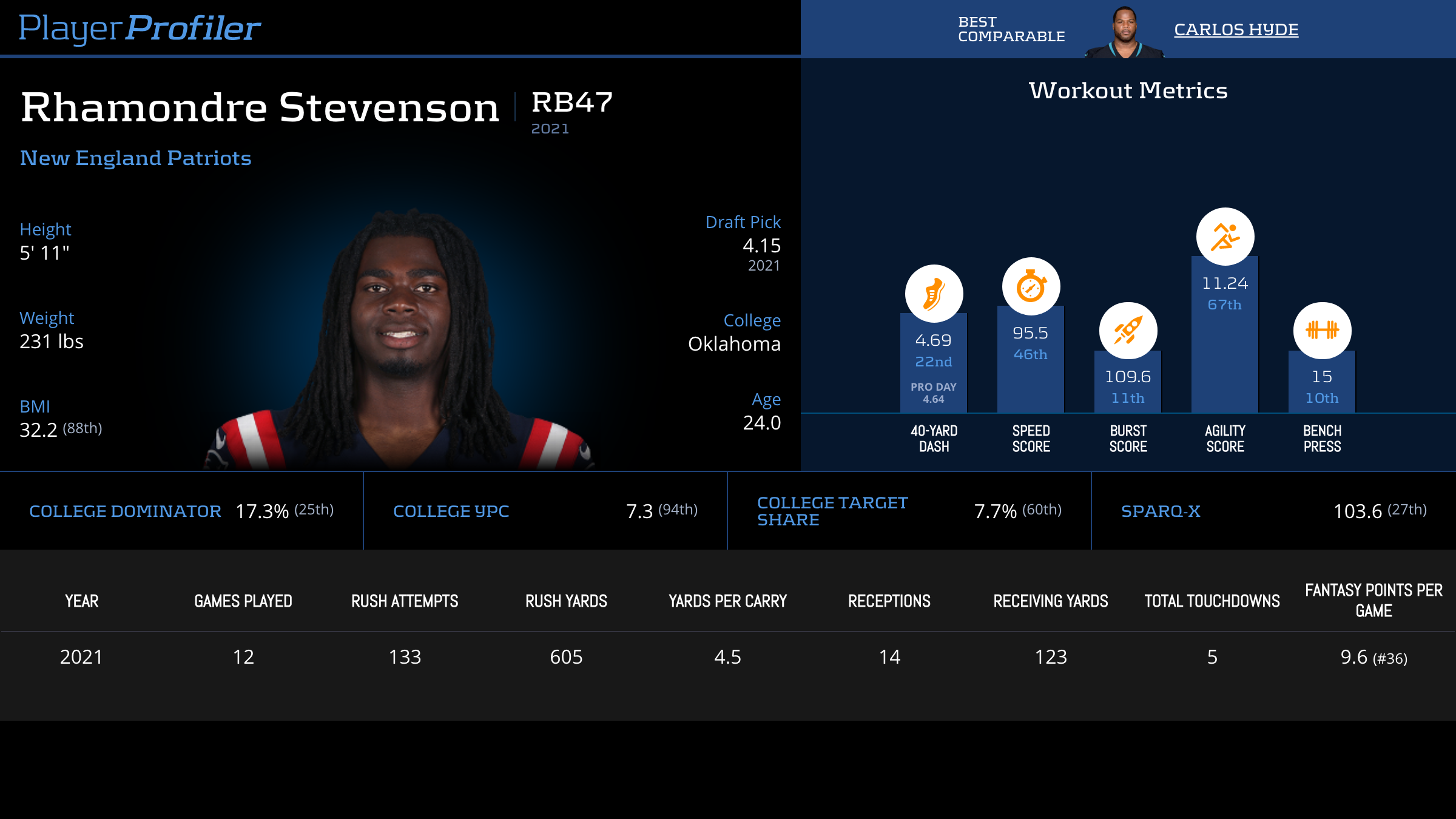 As professionals, those numbers have continued to favor Stevenson. And while both of them have not been very involved in the Patriots passing game (New England tends to have compartmentalized roles for their runners, and neither have been been the primary receiving backs), Stevenson has been more so. Harris’ seasonal Target Share numbers have been 2.5-percent in 2020 and 4.4-percent in 2021. While Stevenson posted a 4.8-percent in 2021. Given their respective Dominator Ratings, those numbers produce Satellite Scores in the 8th-percentile for Harris (in both ’20 and ’21) and in the 24th-percentile for Stevenson.
