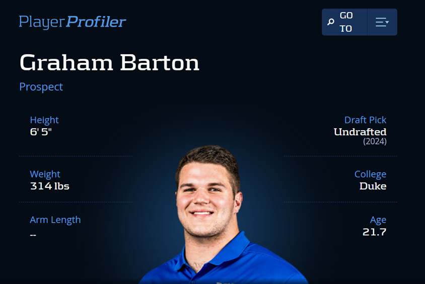 Graham Barton finished his career at Duke with 39 career starts, 34 at left tackle, and five at center in his freshman season. The experienced offensive lineman struggled with injuries his final season with the Blue Devils but still logged 2,569 career snaps at the college level.