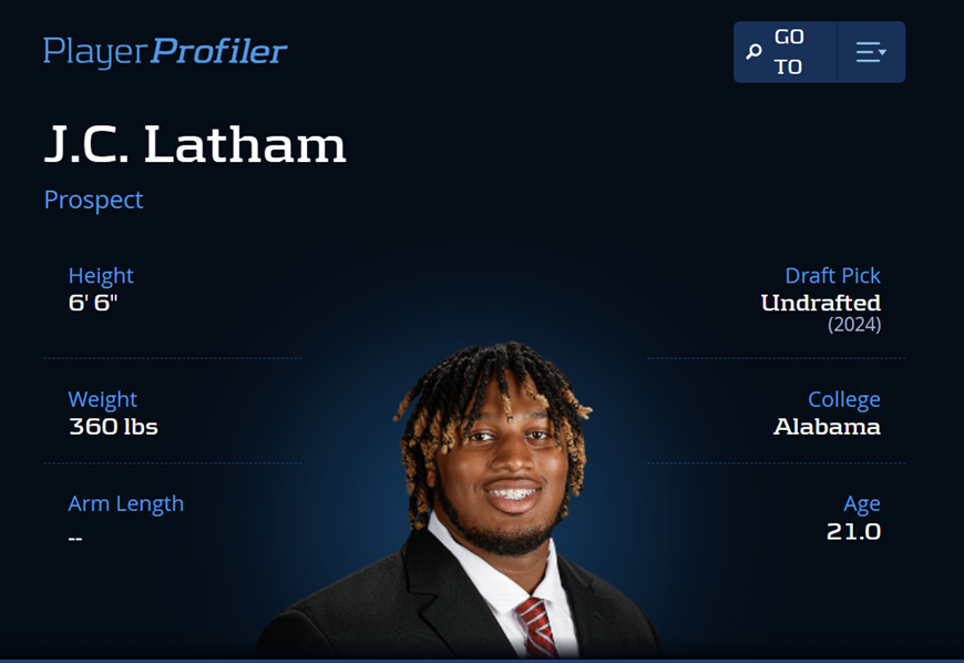 Physically, J.C. Latham is the cookie cutter mold for right tackles in the NFL today. Latham was a two-year starter at Alabama, playing 1,891 snaps in three seasons while allowing just two sacks and 30 pressures on 1,016 pass-pro snaps.