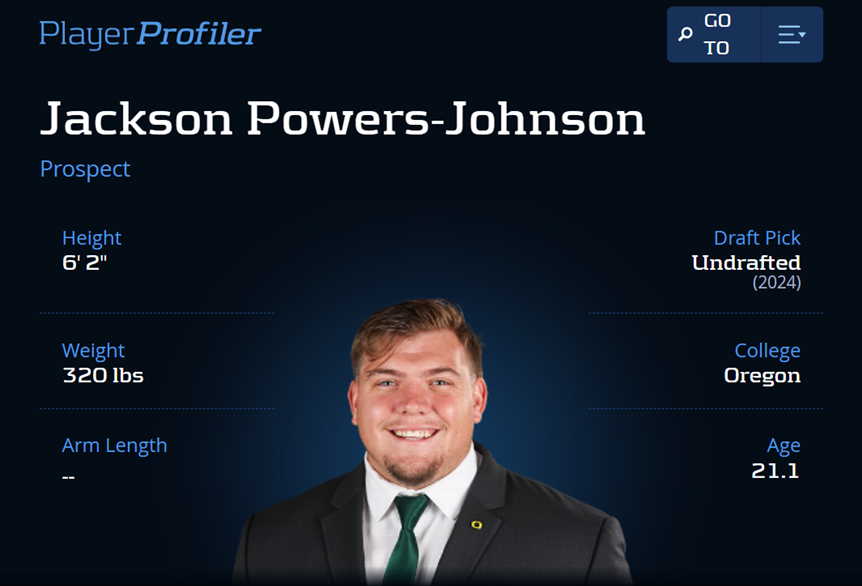 The first prospect with zero experience at tackle is center Jackson Powers-Johnson. Powers-Johnson played 1,355 career snaps at Oregon (primarily at center) but logged just one year as a full-time starter. It is hard to fault him for lack of experience considering he parlayed that one year as a starter into a Rimington Award for the best center in the country.
