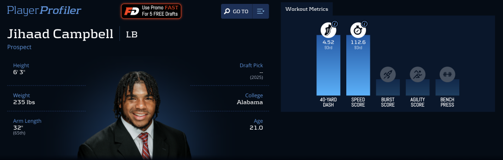 Campell is the class of a surprisingly strong linebacker class. His size and athleticism give him the potential to be elite. He is versatile enough to excel in both blitz packages and coverage schemes and is certain to be a Day 1 starter. Campbell has the potential to be an elite three-down player from the second he hears his name called in the 2025 NFL Draft.