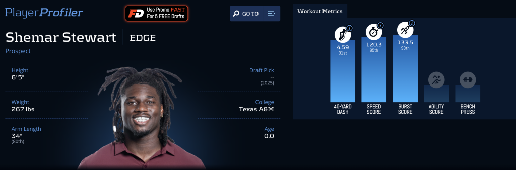 He is massive and explosive and is a disruptive force on nearly every snap but will need to refine the rougher points of his game. Stewart was impressive at the 2025 NFL Scouting Combine and should see himself selected in the first round of the 2025 NFL Draft, but his lack of production in college will likely keep him out of the top 12.