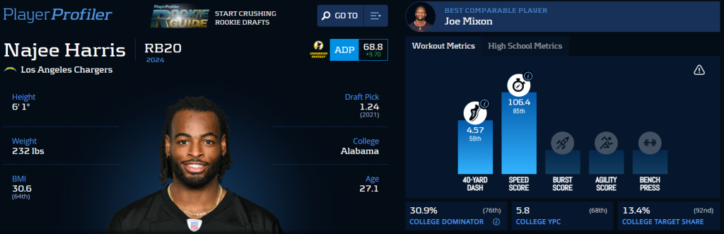 Najee Harris, who’s known for his reliability and consistency, isn’t dynamic enough of a player to hold off Omarion Hampton. Certainly not for the entire season, or even half a season. Harris very well could hold down the fort to start the season as Hampton gets his feet wet, but make no mistake, this will be Hampton’s backfield sooner rather than later. After singing with the Chargers, Harris’ hype and price grew greatly. Now Harris should be valued just above the top handcuffs, as that’s what he will eventually become.