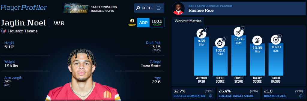 It’s important to remember that the order in which players at the same position get drafted isn’t always an indication of talent. Teams don’t look for the same things in players every time. So there’s some glimmer of hope there. But Jaylin Noel has a lot of competition to get past. We know Nico Collins will get his as the alpha in the offense. The Texans traded for Christian Kirk for a tiny price, but he’s a solid NFL wide receiver. Then we have the aforementioned Jayden Higgins. It’s important to bet on talent first, so you shouldn’t be completely out on Noel, but his projection is much weaker now.