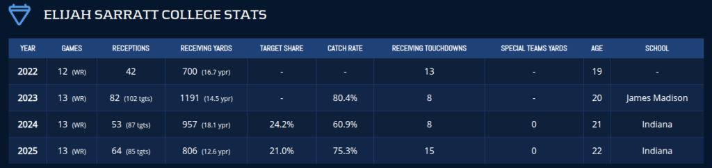 The Ravens are clearly trying to get Lamar Jackson some help on the outside and in the red zone. Lane is 6’4″ and scored a touchdown on 18% of his collegiate catches. Meanwhile, Sarratt led the nation with 15 TD receptions last season.