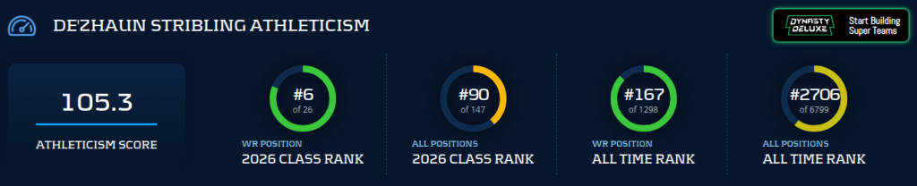 With the premium draft capital, Stribling is now a target for WR-needy dynasty managers in Round 2 of rookie drafts. San Francisco has a crowded receiver room; I don’t expect much production from him as a rookie. But with Mike Evans on the outside, Stribling can learn the X position behind a future Hall of Famer while mixing in as a rotational wideout early on. He’s an intriguing prospect now that he got drafted in real life much earlier than anyone anticipated.