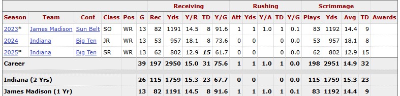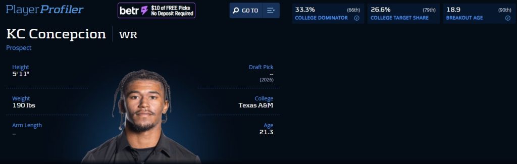 He’s also got a nose for the end zone. In two seasons at North Carolina State, Concepcion caught 16 TD passes and rushed for two scores. Against tougher competition in the SEC in 2025, he found paydirt 10 times — nine through the air and once on the ground.