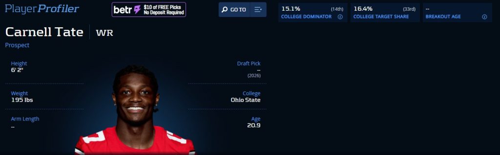 I see a lot of comparisons to Tee Higgins for Tate, and those aren’t entirely off base. He does share some traits and movements with the former Clemson Tiger. Like Higgins, who’s benefited from playing alongside Ja’Marr Chase, there’s a perception that Tate is only a WR2, at best, because defenses focused more on teammate Jeremiah Smith. Smith is a special talent, no doubt. But so is Tate. He’s a gifted technician with flashes of Devonta Smith in the way he moves so fluidly despite his longer frame.