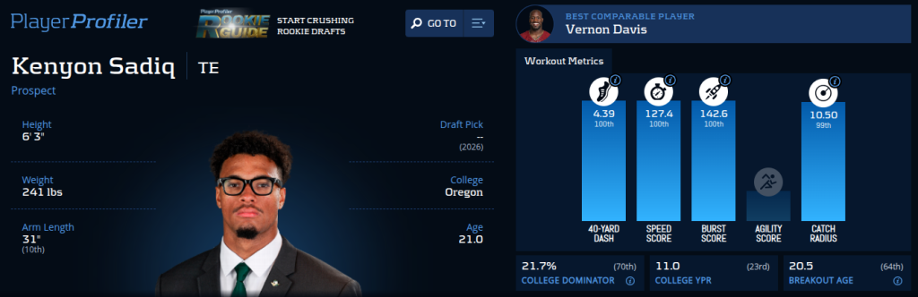 For me, the best choice is Sadiq, especially in any type of Tight End Premium (TEP) scoring. The 6-foot-3-inch, 241-pounder from Oregon is built like the Pokémon Machamp (minus the second set of arms) and proved that his physique was no fluke at the NFL Combine. Sadiq tested out as the most athletic tight end among his peers, breaking the combine TE record with a 4.39 40-yard dash and posting a 43.5” vertical jump.