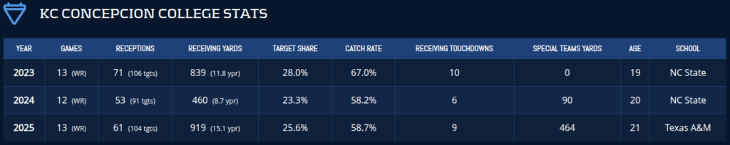 At the NFL Combine, Concepcion measured in bigger than expected. He checked in at 6’0” and 196 pounds, solid measurements for such a twitchy dynamo with the ball in his hands. He also crushed the gauntlet drill, looking like a natural pass-catcher.
