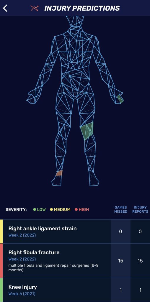 As is common with offensive players on the 49ers, the main issue in this quarterback room is who is going to be healthy. Lance missed the final 16 weeks of the 2022 season with a fractured right fibula, while Purdy left the NFC Championship game with a complete tear of his ulnar collateral ligament. While I have spent the majority of my life in health care, I do not pretend to be an NFL team doctor. With that in mind I will be using the Player Profiler Injury Finder App to guide me through the assessment of both Purdy and Lance from a health perspective.