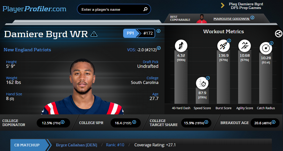 We discussed Damiere Byrd last week before COVID cancelled the Patriots-Broncos game. Unfortunately, Byrd is no longer priced at the stone cold minimum, but he presents a value nonetheless.