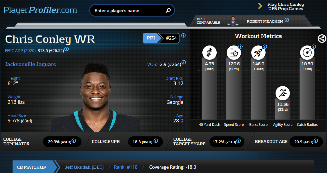 With D.J. Chark trending towards being out, Chris Conley will look to take over as the field-stretching target for the Jaguars in Week 6. The last time Chark missed time, Conley saw over 160 Air Yards. However, he failed to realize any of the opportunity, posting only 6.4 (No. 66) fantasy points in Week 3 against the Dolphins.