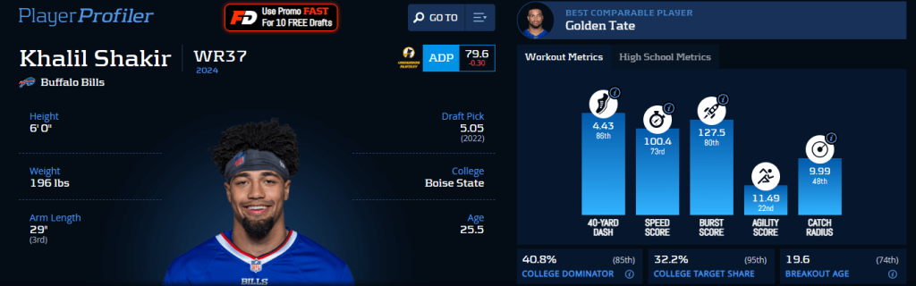 Draft Value: Khalil Shakir, Buffalo Bills (ADP 79.6, WR46)