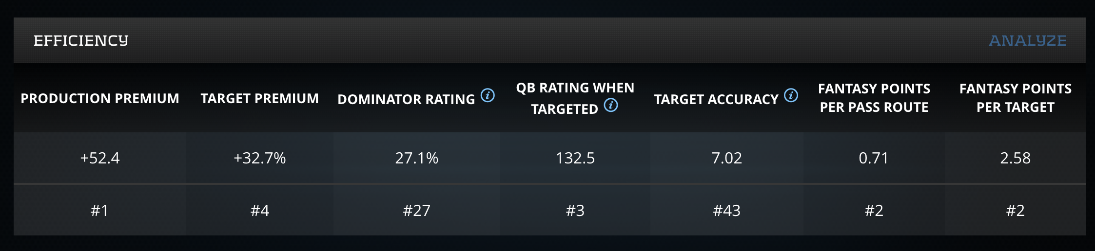 For efficiency, let’s first look at Yards per Reception and Yards per Pass Route. A.J. Brown averaged 20.2 (No. 3) Yards per Reception on a team that averaged barely over 30 pass attempts per game. That’s not sustainable, and there’s no way Brown will again be the second-most efficient receiver in YPR.