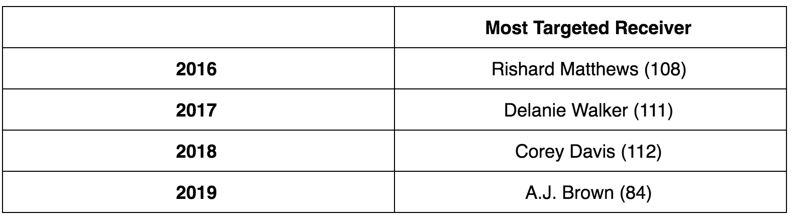 In his 2019 rookie season, A.J. Brown recorded 52 (No. 43) catches, 1,051 (No. 21) receiving yards, and nine (No. 3) touchdowns. His low target and Target Share numbers are unsustainable, and it’s risky to trust a wide receiver with a low target share in a low-volume passing offense.