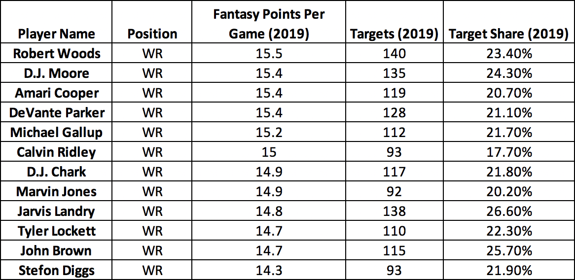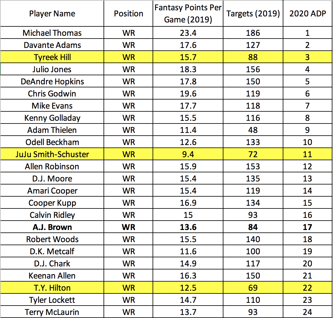 The table above shows the top-24 wide receivers by ADP, their Fantasy Points per Game, and targets. The outliers include Tyreek Hill, JuJu Smith-Schuster, and T.Y. Hilton since they all missed time due to injuries. Smith-Schuster also lost his quarterback in Week 2.