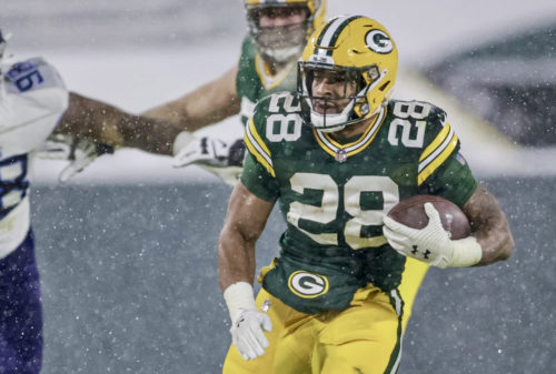 With Jamaal Williams out and Aaron Jones hindered by a hip issue, A.J. Dillon got his chance to show what he’s capable of. He saw a season high 58.1-percent Snap Share and rushed 21 times for 124 yards and two touchdowns in a Week 16 win against the Titans. He hauled in his lone target for five yards. Executing a successful Lambeau leap seemed to be the only real challenge for the rookie on his impressive day.