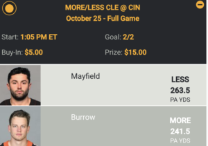 Prop: Joe Burrow Over 241.5 Yards, Baker Mayfield Under 263.5 Yards.