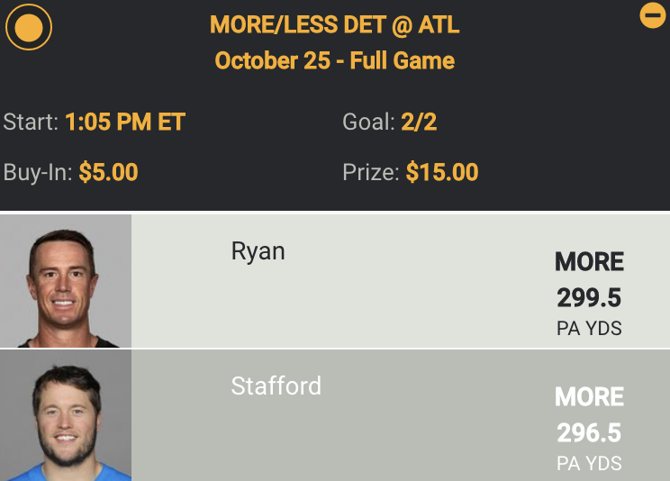 Prop: Matt Ryan Over 299.5 Yards, Matthew Stafford Over 296.5 Yards.