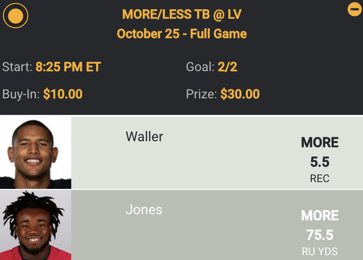 Prop: Darren Waller Over 5.5 Receptions, Ronald Jones Over 75.5 Yards.
