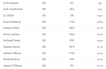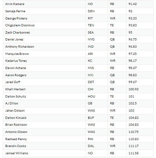 In Underdog drafts, Kamara’s ADP is 99.0 and Williams’ is 127.3. This is where the widest disparity exists among the platforms so far this season.