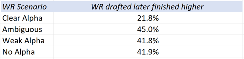 - First Scenario: Clear Alpha – one WR drafted in the top-24 players by ADP, regardless of where other WRs on the same team are drafted.