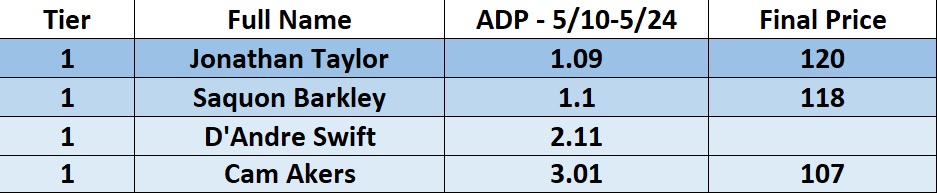 Below are my Tier 1 and Tier 2 RBs and the prices that they went for in a SuperFlex Dynasty Auction draft: