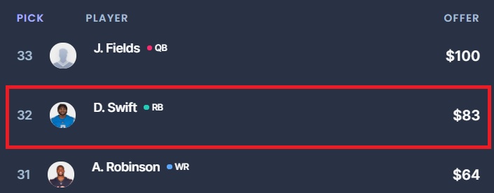 Swift averaged 1.11 (No. 24 among qualified running backs) Fantasy Points Per Opportunity and 14.6 (No. 16) Fantasy Points Per Game as a rookie. Sitting atop the depth chart, this premier college prospect will have more opportunity to exhibit his exquisite all-purpose skill set. I bid aggressively to get him anywhere in the $100-$105 range, and I was fortunate enough to acquire him for a much cheaper price at $83.