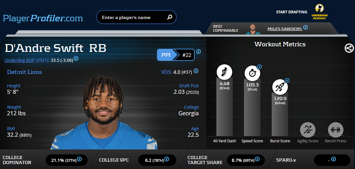 At this point in the draft, D’Andre Swift was the last player available in Tier 1, while Tier 2 RBs Dalvin Cook and Alvin Kamara had already been acquired.