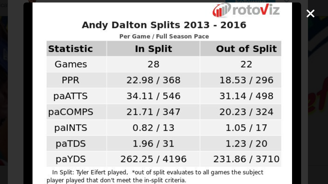 Andy Dalton has proven he can succeed with a good offense around him. In 2015, A.J. Green, Tyler Eifert, Marvin Jones, Mohamed Sanu, and Giovani Bernard all played at least 13 games. Dalton was impressive that year, ranking No. 2 in both passer rating and yards per pass attempt. In 2016, however, his efficiency dipped with Green, Eifert, and Bernard banged up. Dalton finished 2016 with a -4.2 (No. 21) Production Premium and 4.3 (No. 17) air yards per attempt. However, he was unlucky and should expect a positive regression even before accounting for the improved surrounding cast. Looking towards 2017, the weapons are there for Andy to replicate his 2015 success. Provided Green and Eifert stay healthy, the additions of John Ross and Joe Mixon make the Bengals a dangerous offense.