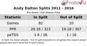 Andy Dalton had a rough season in 2016, tossing just 18 touchdowns. However, this isn’t surprising considering that by the last game of the season he was down his No. 1 WR, No. 1 TE, and No. 1 and No. 2 RBs. Dalton has always been an average quarterback, one whose efficiency depends on the weapons surrounding him.