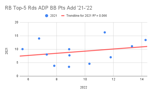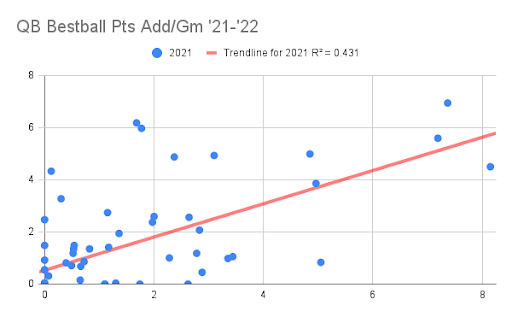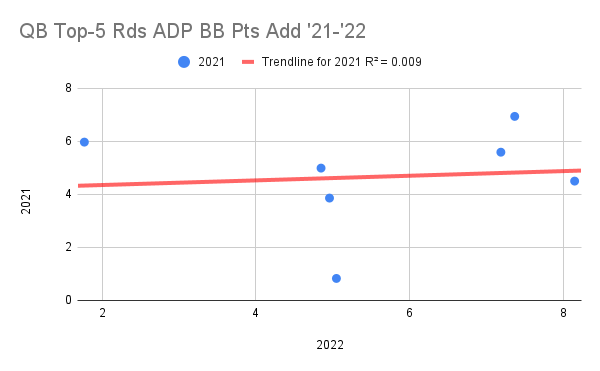Quarterbacks drafted in the top five rounds display weak correlation between their best ball points added rates in 2021 and 2022. This is influenced by a small sample size of quarterbacks, as well as the significant variation in performances, such as Justin Herbert‘s underperformance and Justin Fields‘s rapid rise.