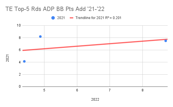 Only three tight ends, Travis Kelce, Mark Andrews, and Hockenson, are typically drafted in the first five rounds. Including George Kittle does not significantly impact the data. However, with a small sample size and weak significance, it’s clear that Kelce has been the difference maker among tight ends.