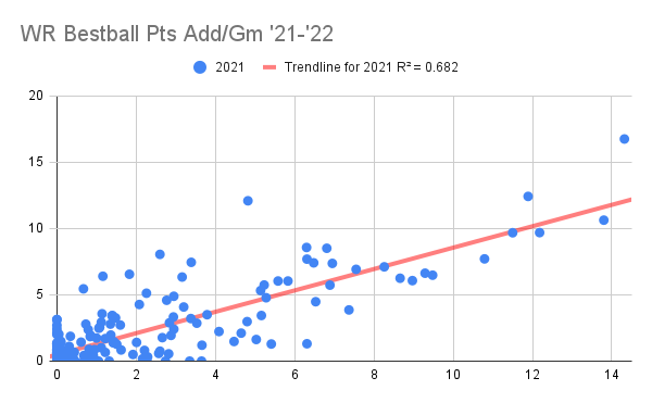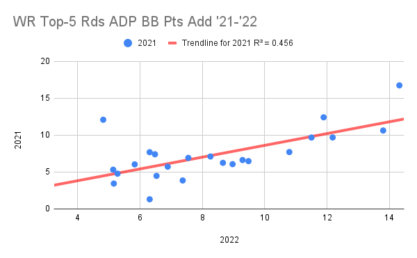 Among the top 60 ADP players, wide receivers showcase a strong correlation between their best ball points added rates in consecutive years. In fact, wide receivers demonstrate the strongest correlation compared to other positions. By removing outliers like Deebo Samuel, the correlation is even more pronounced. This reinforces the idea that wide receivers’ previous year’s production significantly influences their performance in the following year. Furthermore, the large sample size of wide receivers in the first five rounds boosts the reliability of the data.