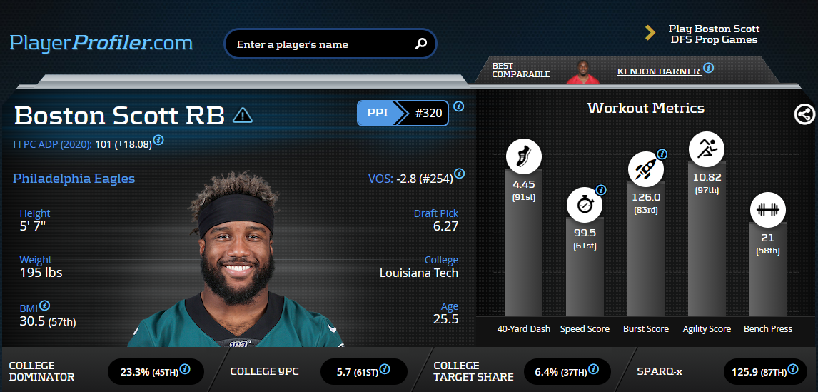 Boston Scott is walking into at least one week of pseudo-starter responsibilities. He’s the next man up, and a short week against the New York Giants ensures that Miles Sanders will sit and that scoring opportunity will be abundant.