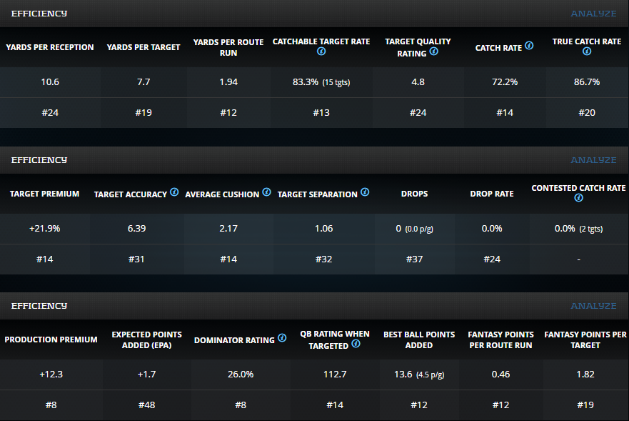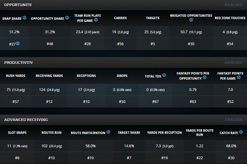 McKissic has a near 50.0-percent Snap Share in every game this season and is running 20-plus routes per game. He has 25 (No. 5 among qualified running backs) targets and a 14.6-percent (No. 7) Target Share. He’s a high-floor PPR Flex option perfect for bye week fill-ins.