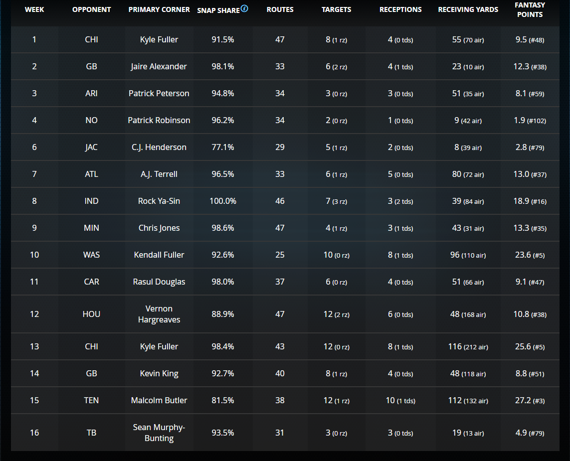 Marquez Valdes-Scantling runs far, evidenced by a 17.9 (No. 1) Average Target Distance. Sometimes he catches the ball, but with a 51.7-percent (No. 99) Catch Rate, it is uncommon. For this reason, he remains a Hail Mary, tournament-only play, especially with David Bahktiari out.