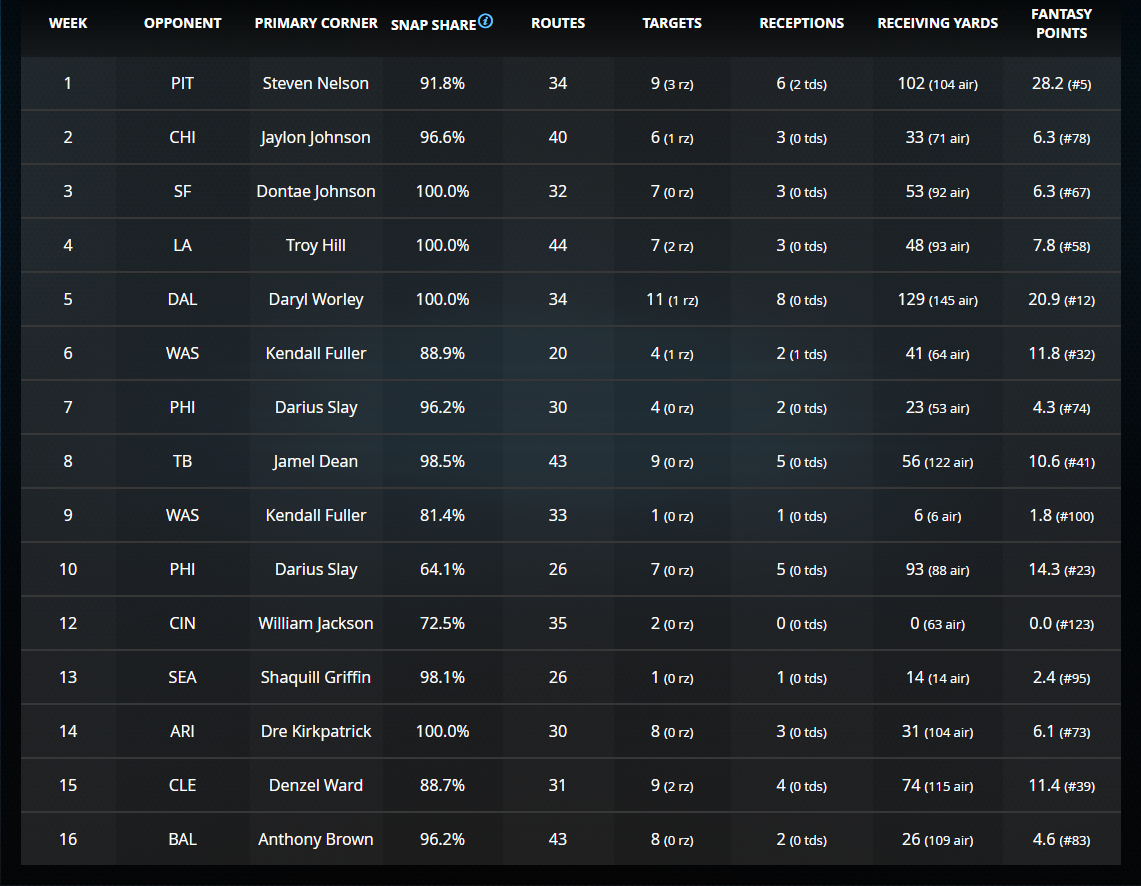 Calvin Ridley continues his reign as the Air Yards play if you are looking to pay up at the position. This is Ridley’s sixth consecutive appearance in this article dating back to Week 12. Since then, he has failed to finish outside of the top 25 receivers in fantasy points scored each week. He has also flashed WR1 overall upside. He remains a strong play again this week.