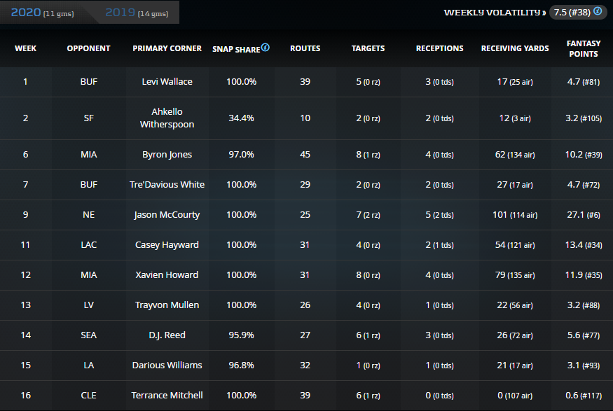 Jerry Jeudy‘s usage in the Broncos offense saw a huge boon last week. His Air Yards had taken a hit after the rookie wide receiver suffered an ankle injury in Week 12. He made up for his lost opportunities in Week 16, seeing 15 targets and 180 Air Yards. Unfortunately, despite this monster usage, he only finished with 12.1 (No. 35) fantasy points. Assuming he is fed again, look for him to straighten out the drop issues and perhaps be a week winner in DFS.