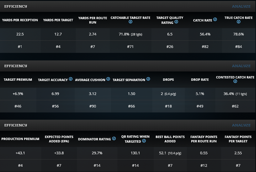 D.K. Metcalf was called a draft bust before the season. Metcalf averages an absurd 22.5 yards per reception, which leads qualified wide receivers, and has a 44.0-percent (No. 3) Air Yards Share on an unleashed Russell Wilson passing offense. He has recorded 92 receiving yards or more in each game this season and made defending NFL Defensive Player of the Year Stephon Gilmore look pedestrian back in Week 2. His 132.2 Air Yards Per Game ranks No. 2, and he has a +43.1 (No. 4) Production Premium. Metcalf’s impressive season is a result of an increase in his efficiency, not his volume. His 7.8 targets per game ranks No. 18, but he’s in the top-12 with 2.74 (No. 7) Yards Per Route Run, 0.55 (No. 12) Fantasy Points Per Route Run, and 2.55 (No. 7) Fantasy Points Per Target.