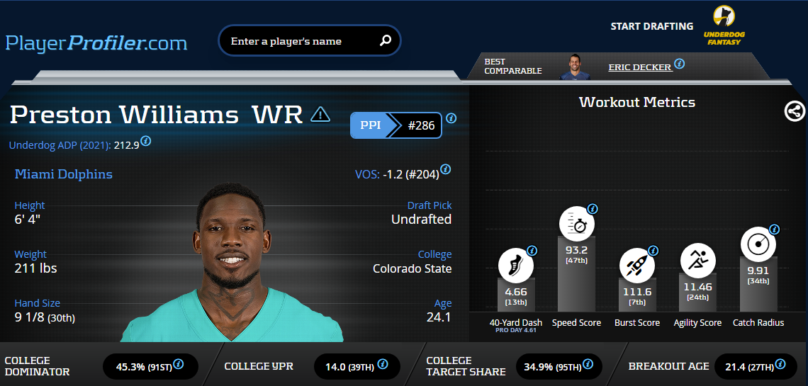 I’ve been a fan of Preston Williams since his rookie year. He scored double digit fantasy points in five of his eight games in his 2019 rookie season, and was well on his way to a breakout before tearing his ACL in Week 9. In a cruel twist of fate, the game he was injured happened to be his best of the season. Williams grabbed five catches for 72 yards and two touchdowns before going down.