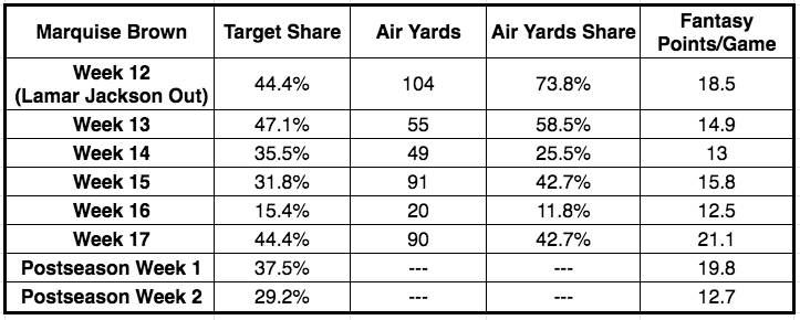 In both postseason games, Brown led the Ravens pass-catchers in receiving yards. Against the Tennessee Titans, he caught seven of nine targets for 109 receiving yards. Then against the Buffalo Bills, he hauled in four of seven targets for 87 receiving yards. Keep in mind that Jackson left the game with a concussion, and Brown could’ve produced more with Jackson healthy. Even though there’s more general variance with a player like Brown, he earned the Target Share, Air Yards, and Air Yards Share we love to see with wide receivers, which eventually translated into fantasy production down the stretch.