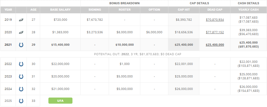 What if Godwin and Robinson can’t save Wentz’s career? Is Indy screwed financially? Good news, Colts fans. If Wentz sucks in 2021, they can move on from him after the season. When a team (Eagles) trades away a player, they take on ALL of the remaining signing bonus (guaranteed money) of the player. Looking at Wentz’s contract, he has no more guaranteed money left on his contract after 2021 for the Colts. Unless they restructure, this acquisition is a one-year test drive at quarterback that may not even cost the team a first-round pick.