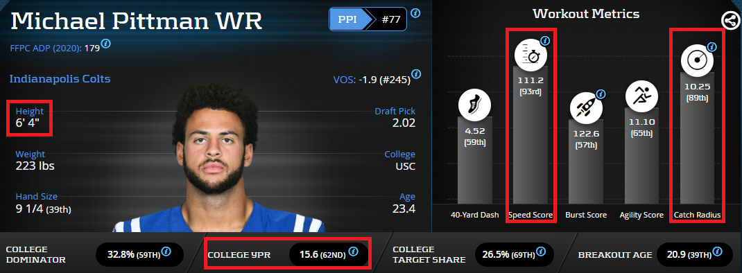Wentz will throw it deep to all of his outside receivers. And with a 10.25 (89th-percentile) Catch Radius, Pittman will make Wentz’s Danger Plays and Interceptable Passes seem less risky.